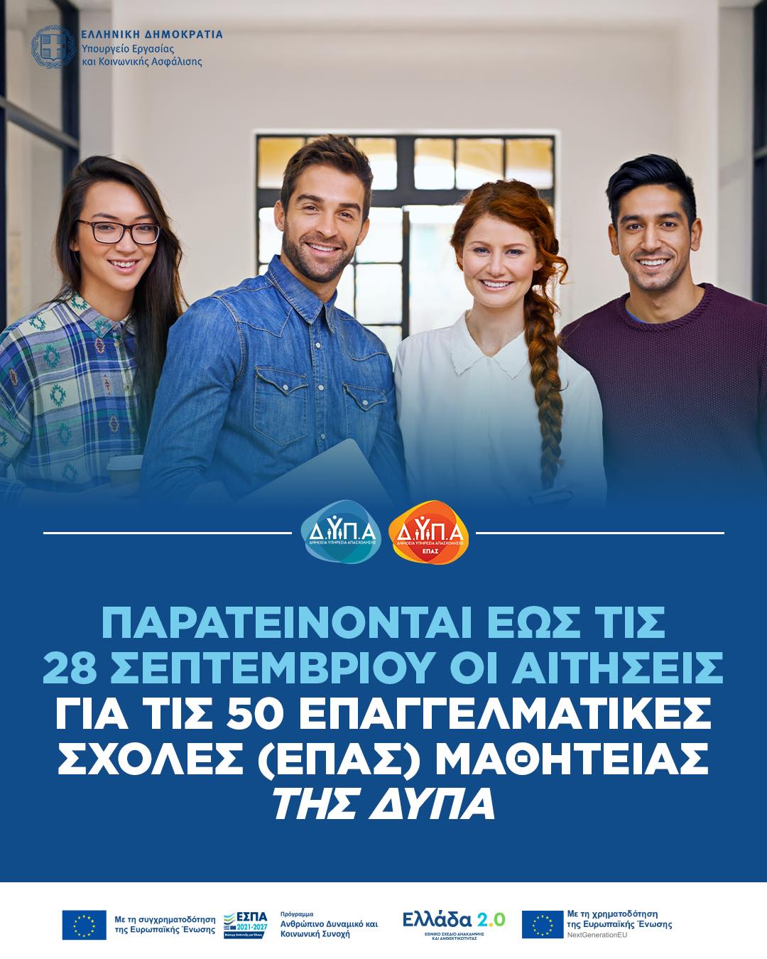 Παρατείνονται έως τις 28 Σεπτεμβρίου οι αιτήσεις για τις 50 Επαγγελματικές Σχολές (ΕΠΑΣ) Μαθητείας της ΔΥΠΑ