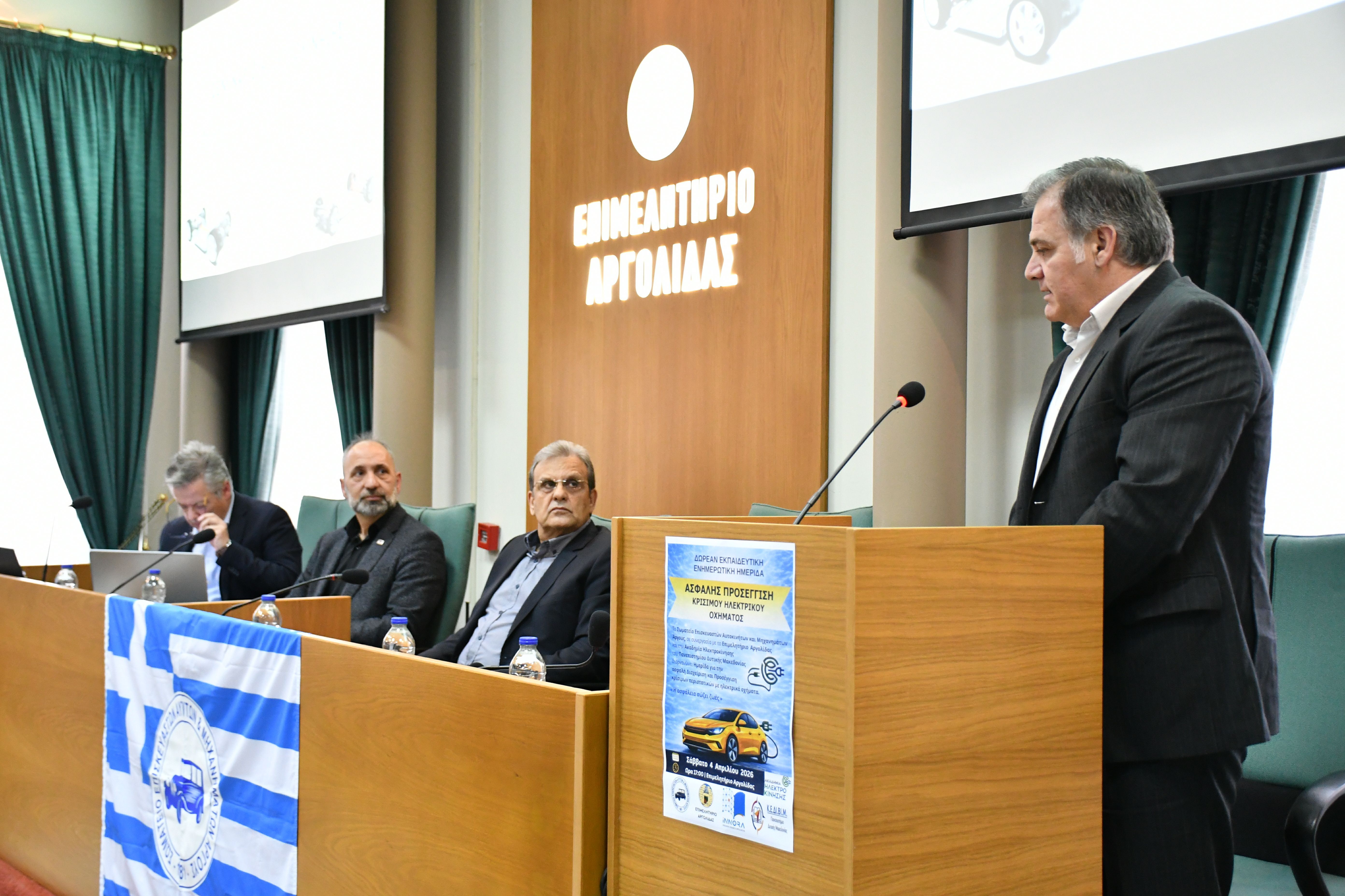 Ο Πρόεδρος του Επιμελητηρίου Αργολίδας κ. Φώτης Δαμούλος στον χαιρετισμό του επεσήμανε πως το Επιμελητήριο προχώρησε στη διοργάνωση αυτής της ημερίδας με το συγκεκριμένο θέμα , αναγνωρίζοντας την ανάγκη της άμεσης και έγκυρης ενημέρωσης των προβλημάτων γύρω από το ηλεκτρικό αυτοκίνητο σε περίπτωση ατυχήματος , θέτοντας ως πρώτη προτεραιότητα την ασφάλεια των πολιτών, των επαγγελματιών, του ανθρώπινου δυναμικού των σωμάτων ασφαλείας και των διασωστών.